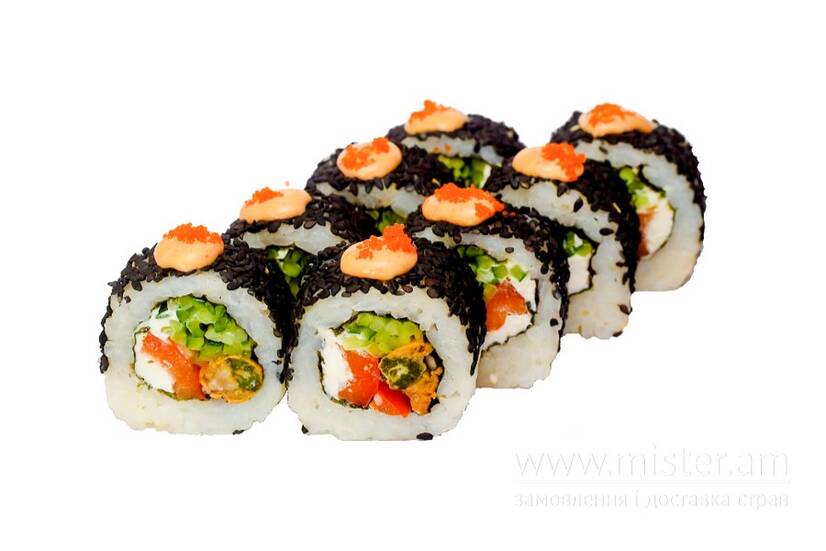 Рис, норі, крем-сир, мідія, огірок, перець болгарський, соус спайсі, кунжут чорний, ікра массаго, імбир, васабі, соєвий соус.