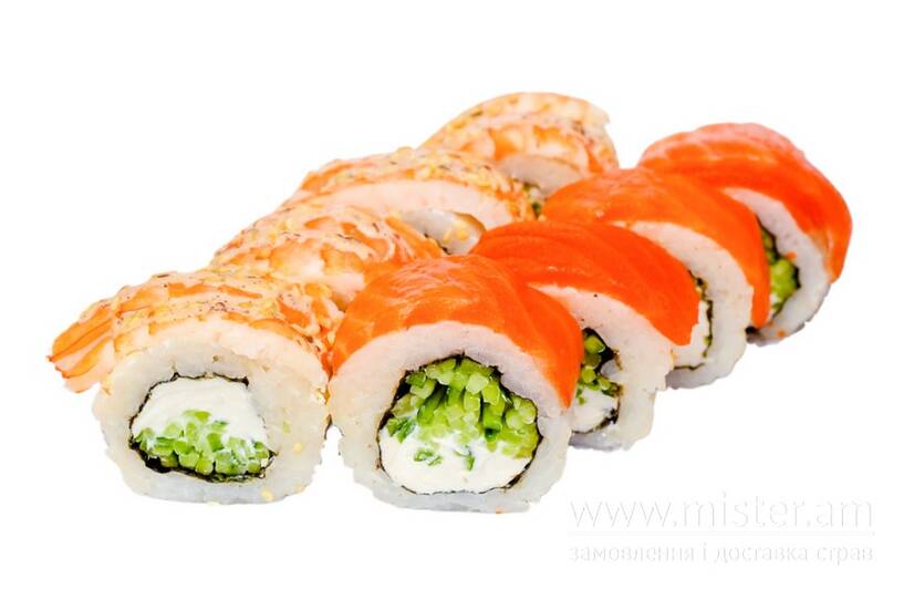 Рис, норі, лосось, креветки, крем-сир, огірок, соус горіховий, кунжут, імбир, васабі, соєвий соус.