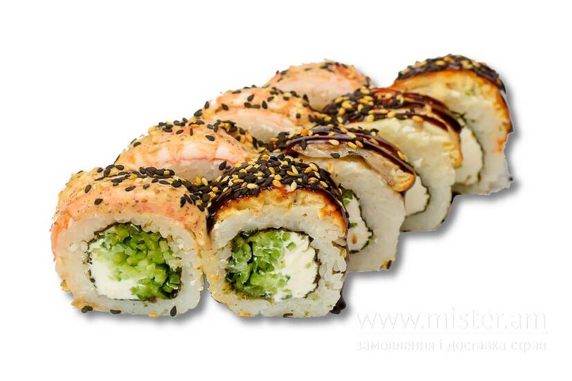 Рис, норі, кревеки, вугор, крем-сир, огірок, соус унагі, кунжут, імбир, васабі, соєвий соус.