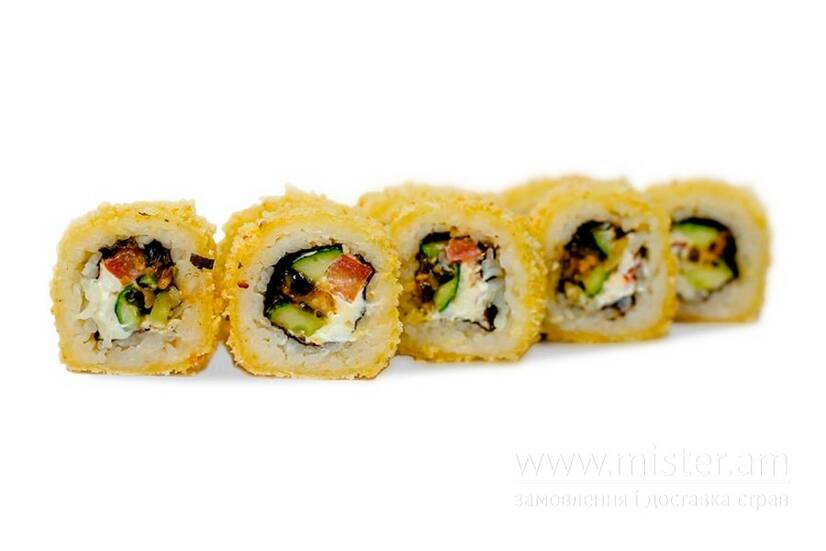 Рис, норі, крем-сир, вугор, огірок, помідор, кляр темпура, соус унагі, кунжут чорний, імбир, васабі, соєвий соус.