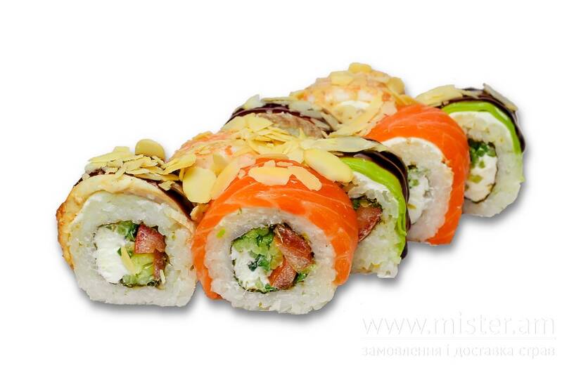 Рис, норі, лосось, вугор, креветка, крем-сир, авокадо, помідор, огірок, соус унагі, мигдальні пластівці, імбир, васабі, соєвий соус.