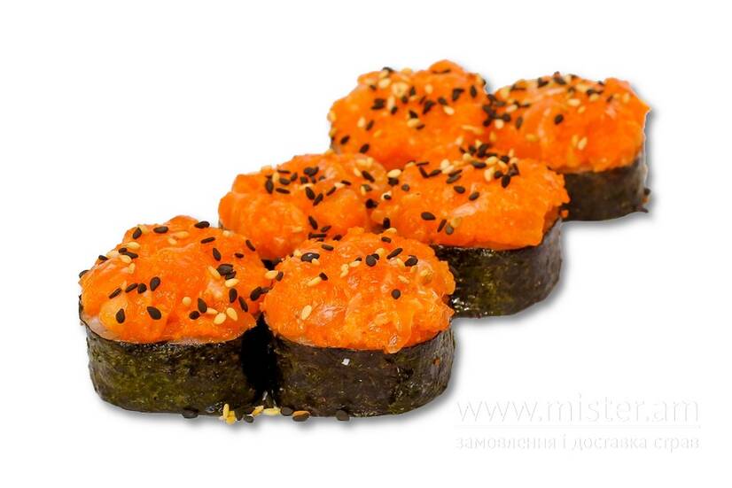 Рис, норі, салат айсберг, лосось, ікра, соус спайсі, кунжут, імбир, васабі, соєвий соус.