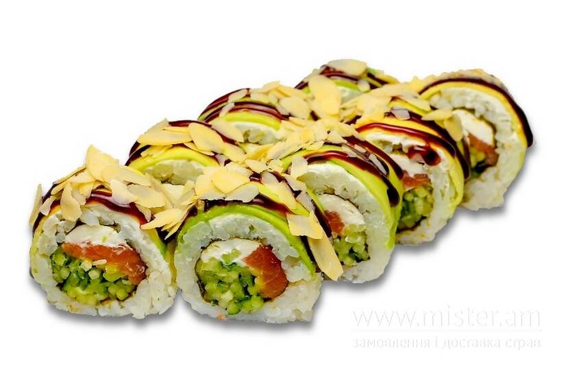 Рис, норі, крем-сир, лосось, огірок, авокадо, соус унагі, мигдальні пластівці, імбир, васабі, соєвий соус.