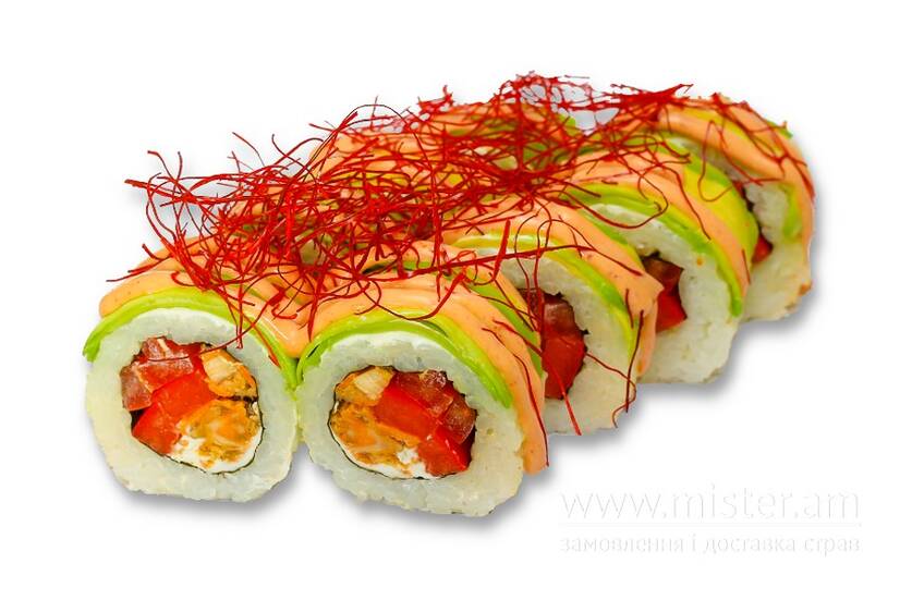 Рис, норі, крем-сир, мідія, помідор, перець болгарський, авокадо, соус спайсі, нитки чілі, імбир, васабі, соєвий соус.
