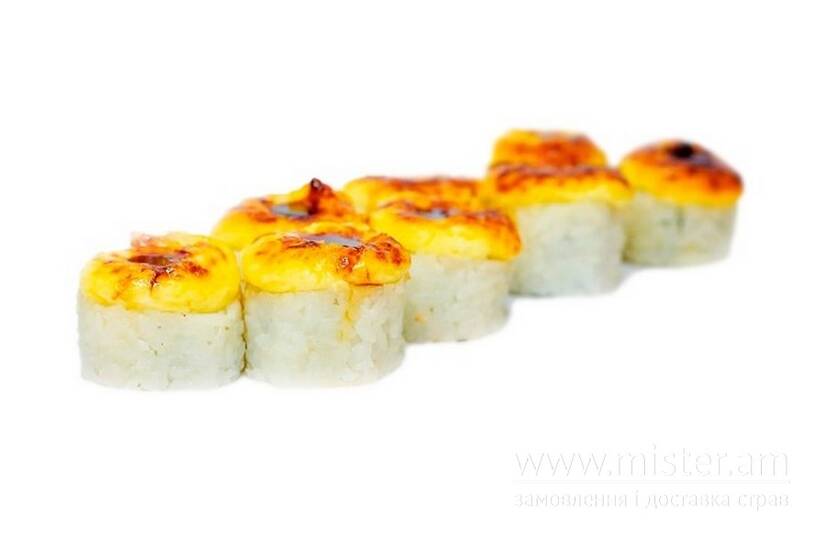 Рис, норі, вугор, крем-сир, айсберг, соус сирний, соус унагі, імбир, васабі, соєвий соус.