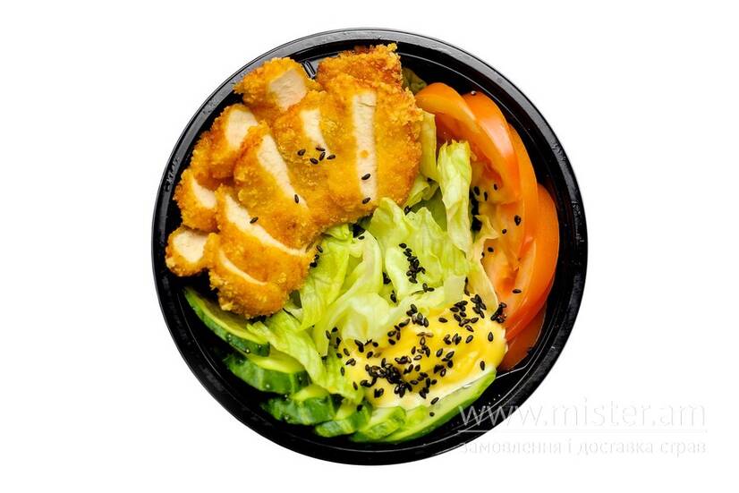 Курячі стріпси, салай айсберг, помідори, огірки, соус медово-гірчичний, кунжут.