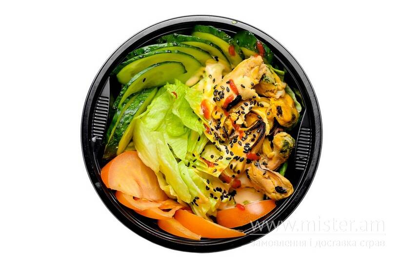 Мідії, помідори, огірки, салат айсберг, соус спайсі, кунжут.