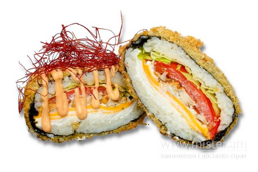Рис, норі, крем сир, філе куряче смажене, сир чеддер, помідор, айсберг, кляр темпура, сухарі панко, соус спайсі, нитки чілі.