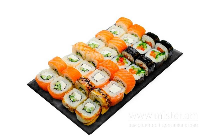 Філадельфія з креветкою (половина); Філадельфія Лайт (половина); Філадельфія Класична (половина); Філадельфія з вугрем (половина); Філадельфія Лайт; Футомакі з лососем, імбир, васабі, соєвий соус.
