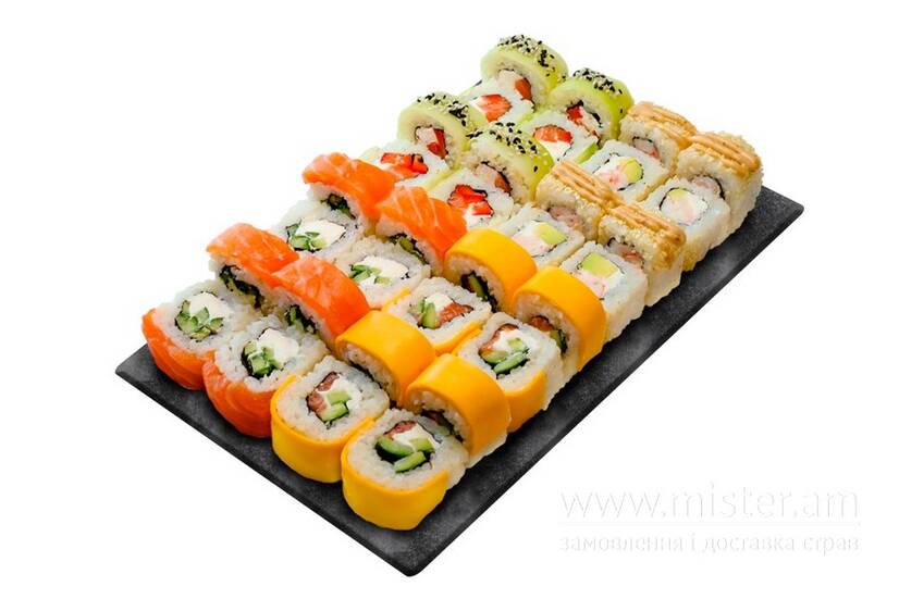 Фреш Рол; Філадельфія Лайт; Каліфорнія з креветкою в кунжуті; Чіз дракон з лососем, імбир, васабі, соєвий соус.