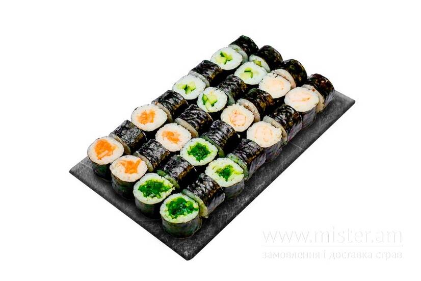 Макі з лососем, макі з креветкою, макі з огірком, макі з хіяші, імбир, васабі, соєвий соус.