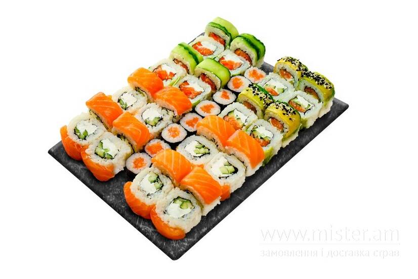 Філадельфія Лайт 2 порц., Фреш Рол, Зелений Дракон з лососем, макі з лососем, імбир, васабі, соєвий соус.