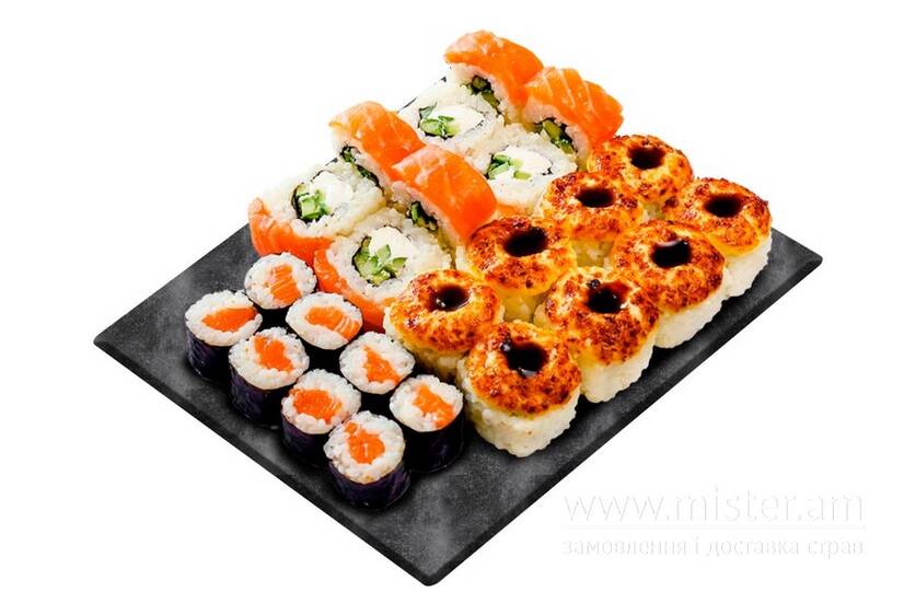 Філа лайт, макі з лососем, Запечений з куркою, імбир, васабі, соєвий соус.