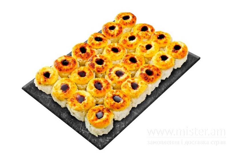 Запечений з куркою, Запечений з лососем, Запечений з мідіями, імбир, васабі, соєвий соус.