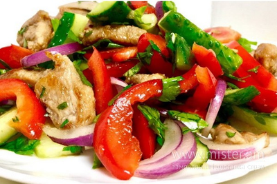 Огірок, помідор, капуста пекінська, перець, телятина.