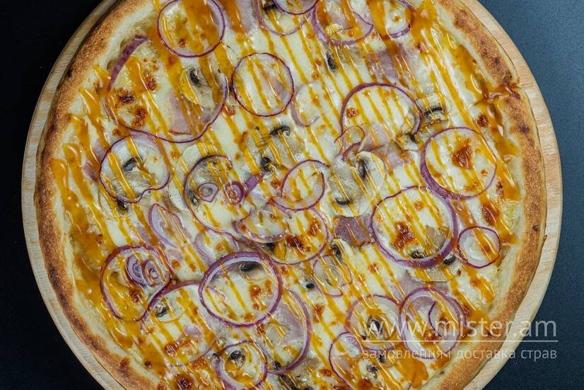 Вершкова основа, моцарела, шинка, печериці, червона цибуля, кисло-солодкий соус.