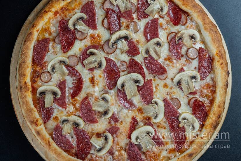 Моцарела, копчені ковбаски, салямі, ковбаски мисливські, печериці.