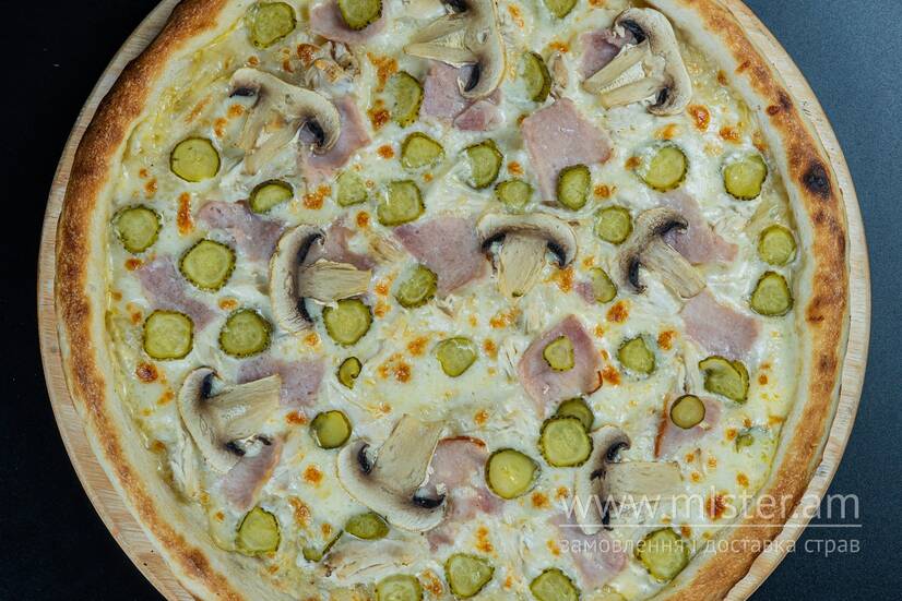 Моцарела, куряче філе, шинка, печериці, мариновані огірки.