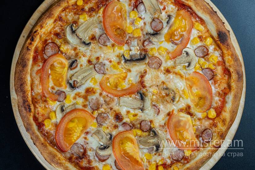 Моцарела, томати, печериці, мисливські ковбаски, кукурудза.