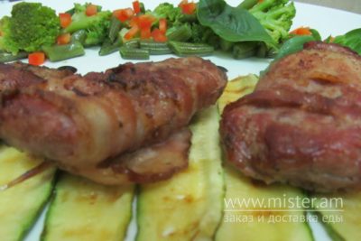 Філе теляти, бекон, кабачок, брокколі, квасоля спаржева, перець болгарський, соус Барбекю, зелень