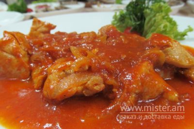 Філе куряче, сік яблучний, помідор, часник, імбир, кетчуп, соус соєвий, черрі, зелень.