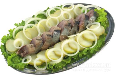Оселедець слабосолоний, картопля смажена, огірок солоний, цибуля, зелень.