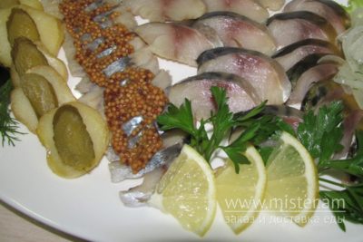 Оселедець, скумбрія слабосолона, скумбрія копчена, картопля смажена, огірок солоний, лимон, зелень.