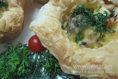 Філе куряче, гриби, цибуля, сир твердий, сметана, тісто листкове, чері, зелень.