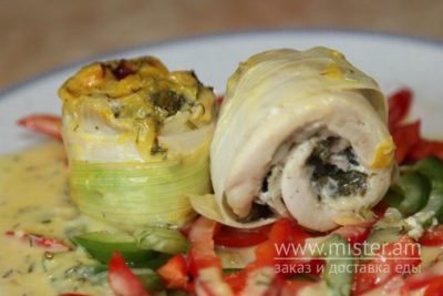 Філе сома, шпинат, морква смажена, цибуля смажена, сир твердий, лимон, зелень.