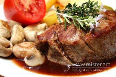 Ошийок свинний, соус Барбекю (кетчуп, помідор , перець болгарський, часник, зелень), лаваш, черрі, зелень