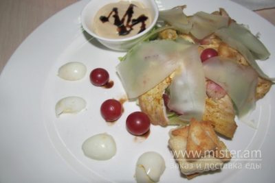 Філе куряче смажене, бекон, яйце перепелине, айсберг, сухарики, чері, соус Цезар.