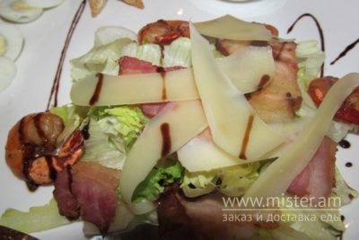 Креветки, бекон, яйце перепелине, сухарики, айсберг, сир Пармезан, соус Цезар, соус бальзамічний.
