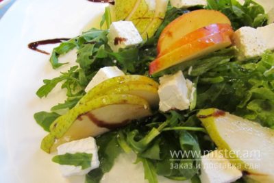 Груша, яблуко, сир Фета, рукола, листя салату, зелень, олія оливкова, сік лимонний.