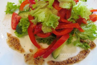 Огірок свіжий, помідор свіжий, перець болгарський, листя салату, гірчиця зернова, олія оливкова.