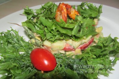 Лосось слабосолоний, авокадо, огірок свіжий, чері, листя салату, креветка, сік лимонний, майонез, зелень.