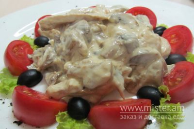 Філе куряче смажене, баклажан смажений, печериці смажені, помідор свіжий, маслини, листя салату, майонез, часник.