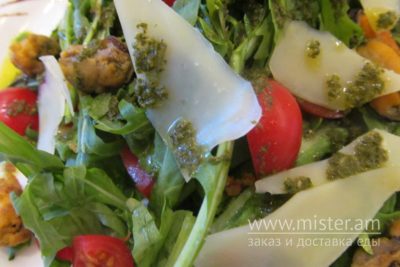 Рукола, мідії, чері, сир Пармезан, соус Песто.