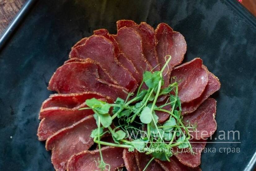 Бастурма, суджук, крильця курячі, арахіс смажений, чіпс-лаваш, грінки, соус часниковий, соус BBQ.