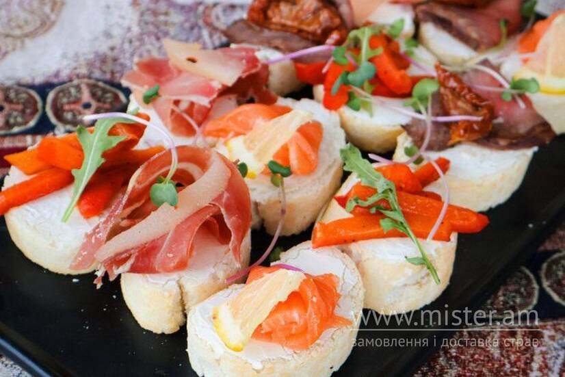 Брускет з лососем, брускет з прошуто та грушою, брускет з ростбіфом, брускет з печеним перцем.
