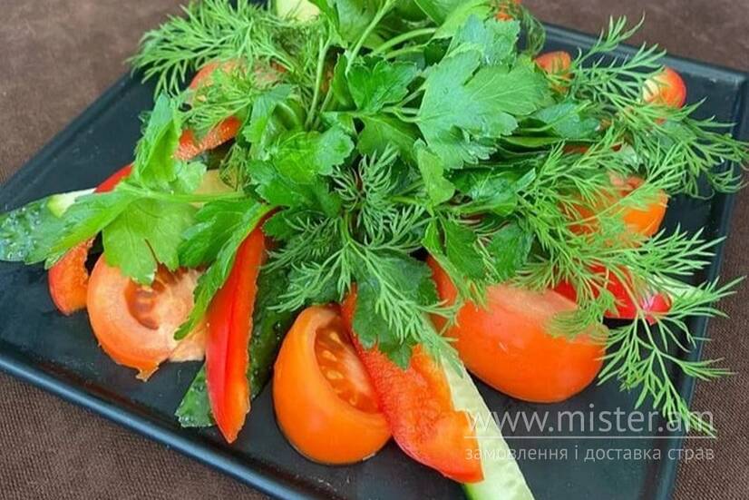 Помідор, огірок, перець, зелень.