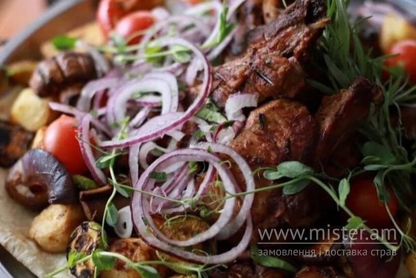 Каре с телятини смажене на мангалі, картопля смажена на мангалі та овочі гриль.