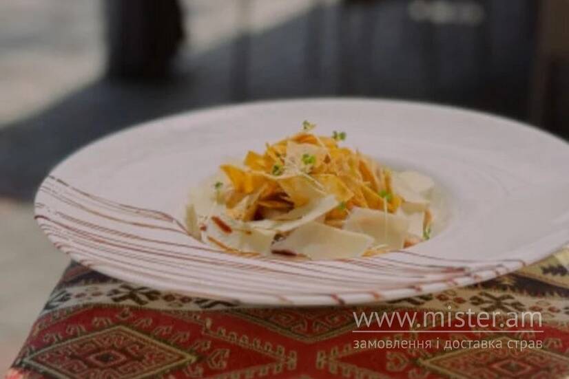 Лист салату, філе куряче, томати чері, соус Цезар, сир пармезан, чіпс-лаваш.