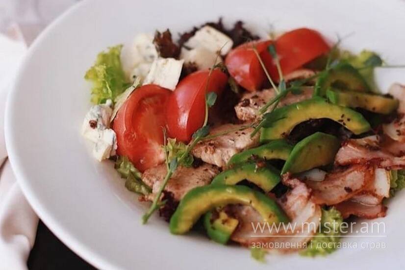 Салат, курка, бекон, дор-блю, авокадо, томат, соус.