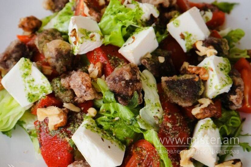 Салат, перець печений, фета, соус песто, мікс горіхів, томати чері, баранина.