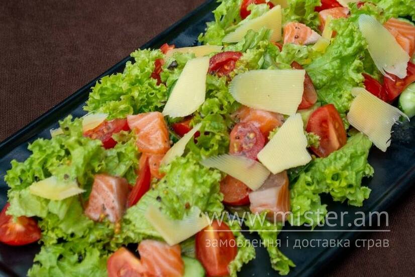 Лист салату, лосось, томати чері, сир пармезан, огірок свіжий, соус американський.