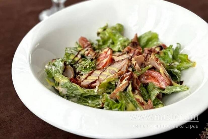 Лист салату, в'ялені томати, томати чері, телятина, соус Цезар.
