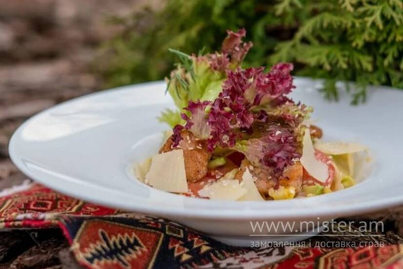 Лист салату, індичка, томати, авокадо, пармезан, соус.