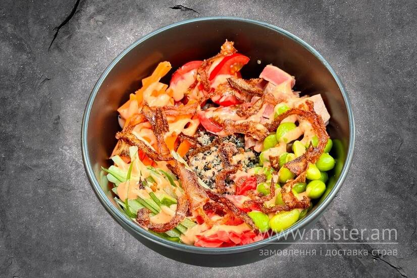 Кіноа, тунець гриль, соус спайсі, огірок, бебі морква, боби едомаме, помідори чері, імбир маринований, цибулевий кранч.