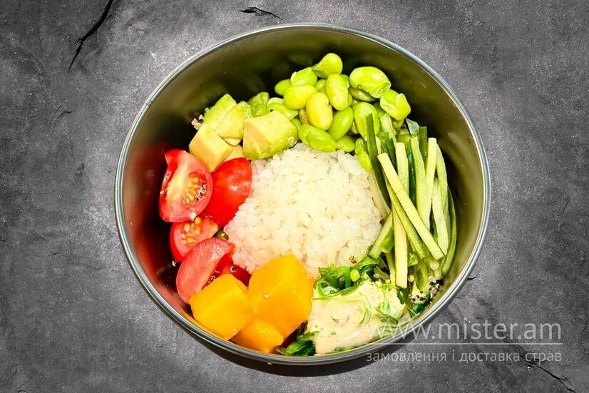 Рис, авокадо, томати чері, манго, огірок, салат чука, боби едомаме, горіховий соус.