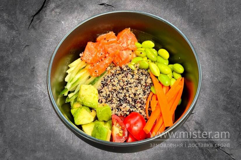Кіноа, лосось, помідори чері, авокадо, бебі морква, огірок, боби едомаме, місо соус, горіховий соус.